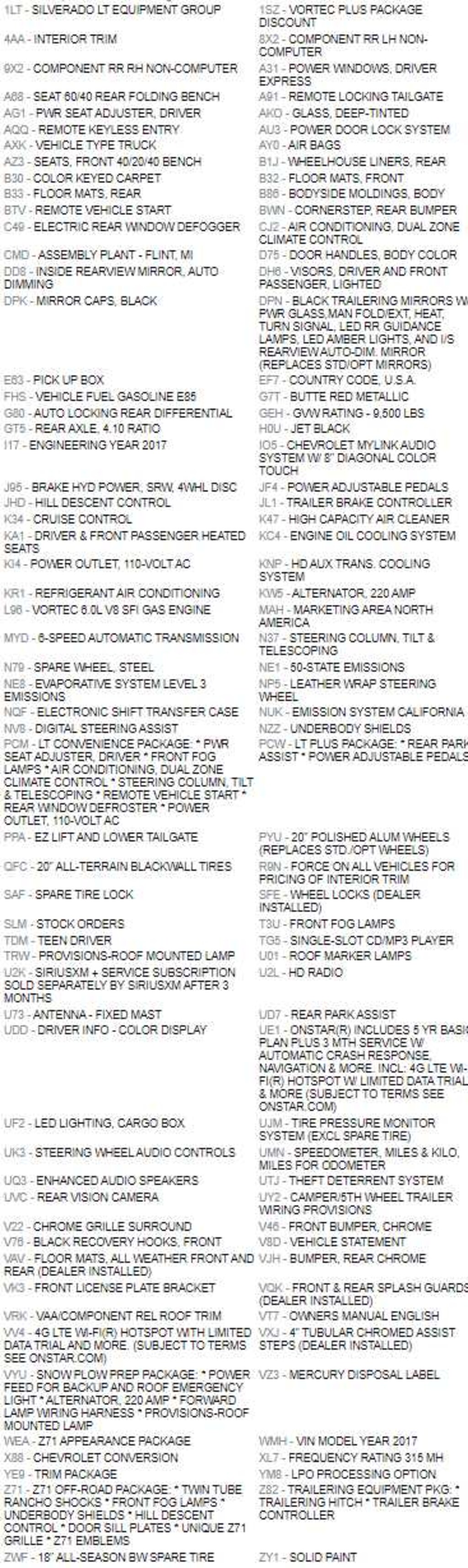WHEELS, 20" 5-SPOKE POLISHED ALUMINUM includes 18" x 8" (45.7 cm x 20.3 cm) steel spare wheel. LT CONVENIENCE PACKAGE includes (AG1) driver 10-way power seat adjuster when ordered with (AZ3) bench seats only, (BTV) Remote vehicle starter system, (C49) rear-window defogger, (N37) manual tilt and telescoping steering column, (KI4) 110-volt power outlet, and (T3U) fog lamps. Crew Cab and Double Cab also includes (CJ2) dual-zone climate control. LT PLUS PACKAGE for Crew Cab and Double Cab, includes (UG1) Universal Home Remote, (UD7) Rear Park Assist, (JF4) power adjustable pedals, (A48) rear sliding power window and (C49) rear-window defogger, LPO, ASSIST STEPS - 4" CHROMED ROUND, TRAILERING EQUIPMENT Trailering hitch platform 2.5" with a 2.0" insert for HD, 7-wire harness with independent fused trailering circuits mated to a 7-way sealed connector to hook up parking lamps, backup lamps, right and left turn signals, an electric brake lead, battery and a ground, The trailer connector also includes the 4-way for use on trailers without brakes - park, brake/turn lamps Includes (JL1) trailer brake controller. Z71 PACKAGE, OFF-ROAD: includes twin tube Rancho brand shocks, (JHD) Hill Descent Control, (NZZ) underbody shields. Also includes brushed metal Z71 door sill plate, unique Z71 gauge cluster, unique finish interior trim plates, unique lower bumper appearance, unique grille design with Z71 badge and Z71 pickup box decals Includes (T3U) fog lamps. SEAT ADJUSTER, DRIVER 10-WAY POWER, MIRRORS, OUTSIDE HEATED POWER-ADJUSTABLE VERTICAL TRAILERING, UPPER GLASS, MANUAL-FOLDING AND EXTENDING, BLACK; Includes integrated turn signal indicators consisting of 51 square inch flat mirror surface positioned over a 24.5 square inch convex mirror surface with a common head and lower convex spotter glass (convex glass is not heated and not power adjustable) and addition of auxiliary cargo lamp for backing up (helps to see trailer when backing up with a trailer) and amber auxiliary clearance lamp (Includes (DD8) auto-dimming inside rearview mirror.), REMOTE VEHICLE STARTER SYSTEM Includes (UTJ) Theft-deterrent system.), SEATING, HEATED DRIVER AND FRONT PASSENGER, SNOW PLOW PREP PACKAGE: includes power feed for backup and roof emergency light, (KW5) 220-amp alternator with gas or diesel engine, forward lamp wiring harness, (TRW) provision for cab roof mounted lamp/beacon, (NZZ) underbody shields and Heavy-Duty front-springs, SEATS, FRONT 40/20/40 SPLIT-BENCH, 3-PASSENGER. Available in cloth or leather. Includes driver and front passenger recline with outboard head restraints and center fold-down armrest with storage. Also includes manually adjustable driver lumbar, lockable storage compartment in seat cushion, and storage pockets. (STD), REAR AXLE, 4.10 RATIO, AUDIO SYSTEM, CHEVROLET MYLINK RADIO WITH 8" DIAGONAL COLOR TOUCH-SCREEN, AM/FM STEREO with seek-and-scan and digital clock, includes Bluetooth® streaming audio for music and select phones; USB ports; auxiliary jack; voice-activated technology for radio and phone; and Shop with the ability to browse, select and install apps to your vehicle. Apps include Pandora, iHeartRadio, The Weather Channel and more. (STD), ENGINE, VORTEC 6.0L VARIABLE VALVE TIMING V8 SFI, E85-COMPATIBLE, FLEXFUEL capable of running on unleaded or up to 85% ethanol (360 hp [268.4 kW] @ 5400 rpm, 380 lb-ft of torque [515.0 N-m] @ 4200 rpm) (STD), TRANSMISSION, 6-SPEED AUTOMATIC, HEAVY-DUTY Keyless Entry, Privacy Glass, Steering Wheel Controls, Electronic Stability Control, Bed Liner. /